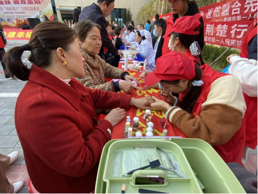 文艺表演同期,医疗志愿服务区同样热闹有序。口腔医学院与护理学院的师生们搭建起专业问诊台,聚焦社区居民健康需求,提供细致周到的身体健康问诊服务。问诊过程中,师生们耐心倾听居民诉求,详细询问身体状况、既往病史及生活习惯,针对常见的呼吸道疾病、关节不适、慢性基础病等问题,结合专业知识给出科学诊疗建议与健康管理方案;同时还向居民普及秋冬季节疾病预防、合理用药、膳食搭配等健康知识,帮助大家提升自我保健意识。卫生技术学院的志愿者们则发挥专业所长,在现场设置拔罐、按摩服务专区,为饱受肩颈酸痛、腰背不适困扰的居民提供理疗服务。志愿者们手法娴熟,力度适中,一边操作一边讲解保健知识,让居民们在舒适体验中缓解身体疲劳,不少居民竖起大拇指称赞:“大学生们技术专业、态度也好,真是实实在在为我们办实事!”